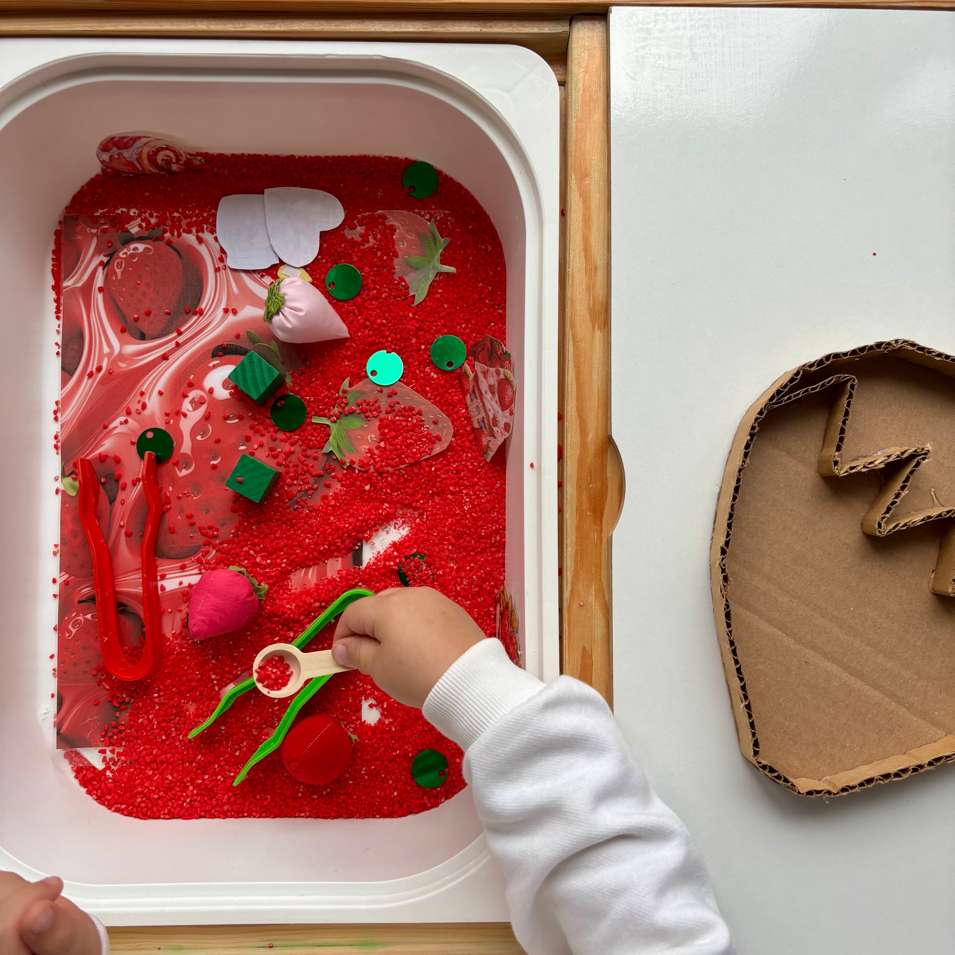 🍓 Kırmızı pirinçlerle dolu duyusal alanda çocuklar, hem eğlenir hem de farkında olmadan öğrenir.